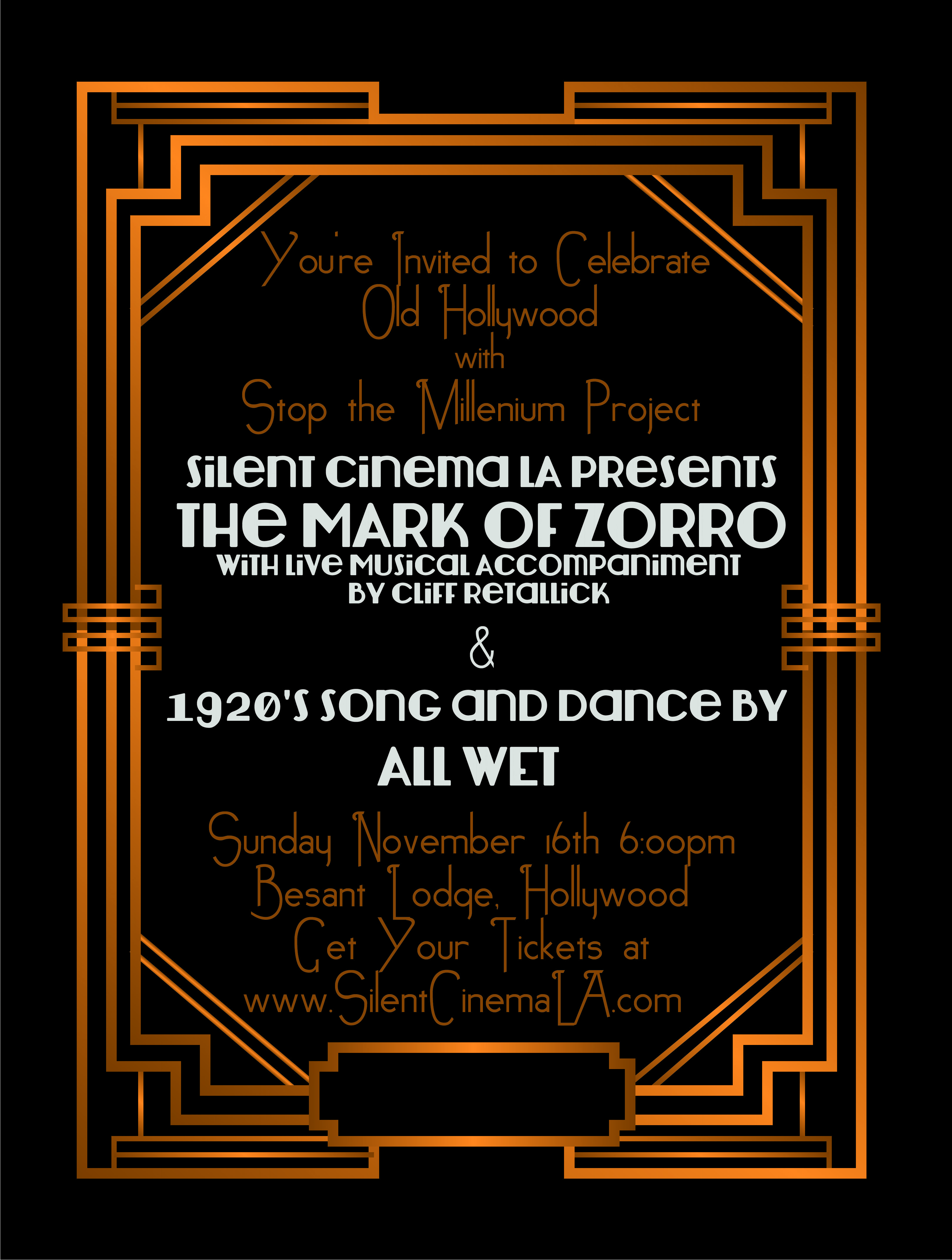 We are organizing an old Hollywood night of entertainment at the stunning Besant Lodge on Beachwood. It was the 1st private Silent movie house in LA, so we’ll be screening a print of the silent classic The Mark of Zorro with Live Musical Accompaniment as well as 1920’s song & dance by All Wet.
